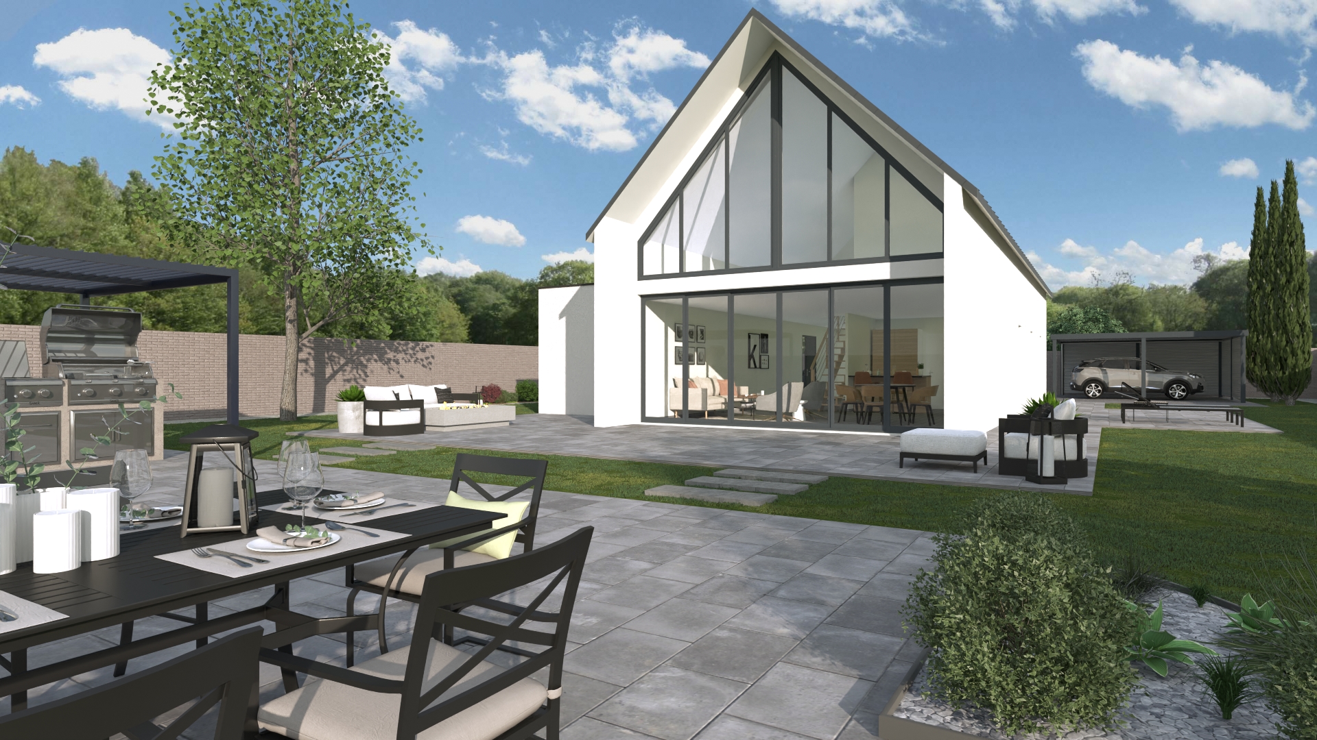 Avec ses combles aménagés, une grande mezzanine ouverte et une spacieuse verrière couvrant l’ensemble du pignon, cette maison invite à profiter pleinement de chaque espace intérieur comme extérieur.